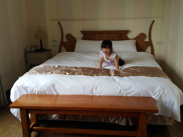 翾寶不管到飯店還是民宿,每次一到房間就是爬上床開始蹦蹦跳