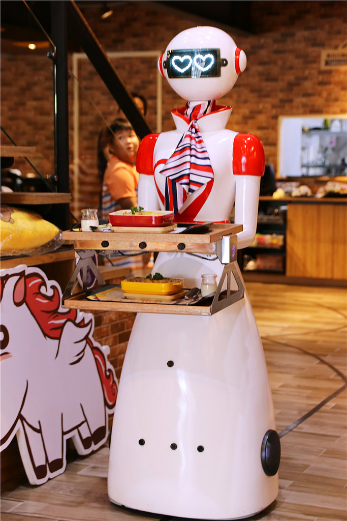 在餐廳裡總共有2台ALIZ公主機器人來為所有現場的客人做服務