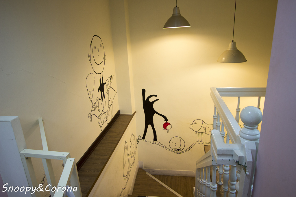 樓梯間看到了可愛的漫畫圖案,像是訴說著一個冒險故事,富有童趣。