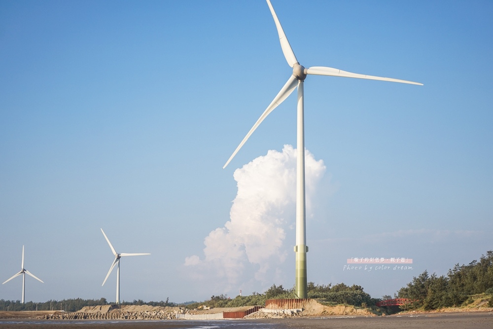 ⇓哇!到啦!白色的風力渦輪機佇立在眼前,好壯觀!小孩都說是風車~