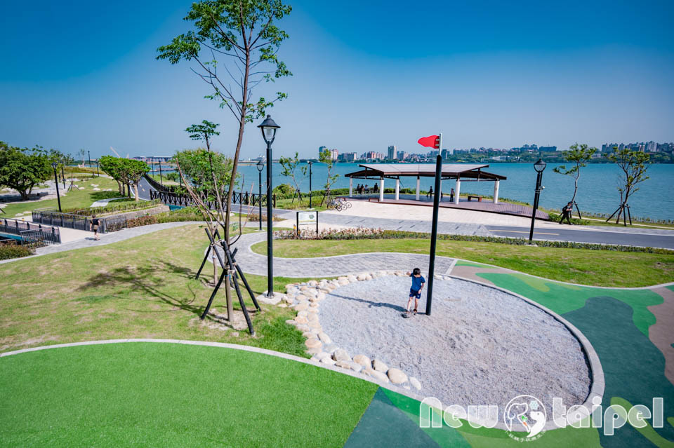 占地約2公頃的八里左岸漫步廣場包含打卡點:景觀看臺區與河岸網美鞦韆,還有迷彩風的翠堡遊戲場,同時也將自行車道拓寬加入此建設內容裡,人車分流的規劃讓行經此路段的自行車不再打結,全面性的整頓讓此地區有煥然一新的面貌。