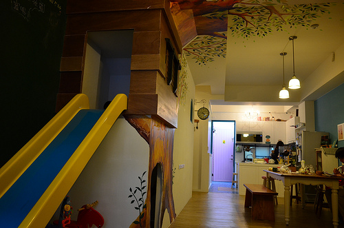 然後要來介紹一下房型,因為網頁上看不太出來差別,當初我很早預定,看不出房型差別所以選了比較高的三樓,想說這樣不會有樓上的小朋友蹦蹦跳,雖然我住的這一間已經非常好,但是現場有媽媽推薦他們住的那一間,簡單來說這一整棟都是親子民宿,總共有四個房間(我只知道有四間),一樓是公共空間,有餐廳有沙發有廁所有室內溜滑梯