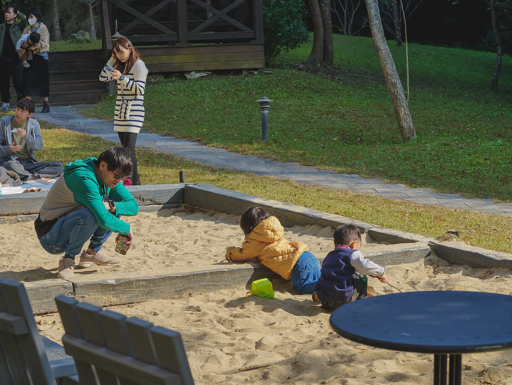 其實園區並不大,絕大部分的空間是留給大草坪,讓旅客可以鋪上野餐墊休憩,前往的當天是個天氣非常舒適的週末,其實,除了親子客之外,更多的是情侶帶著寵物一起前來,下午時分,大家就這樣在草地上曬著暖陽,著實愜意。另外,園區有一處『白色的夢幻小森教堂』,也是婚紗外景常常會安排的景點;而小朋友最喜歡的『白沙區』,也算是相當乾淨,但需要自行攜帶玩沙道具喔!