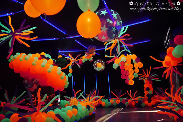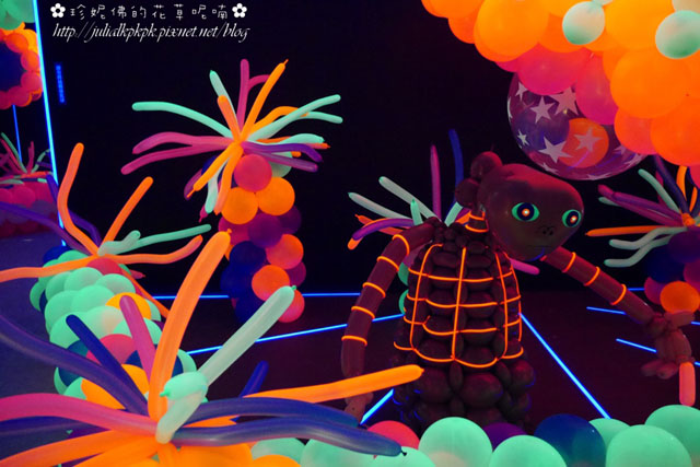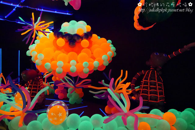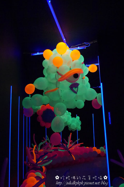 「光影星球」裏頭的布幕都是黑色的,而裡面所有的氣球都是螢光會發亮的感覺