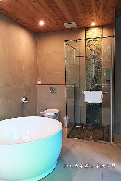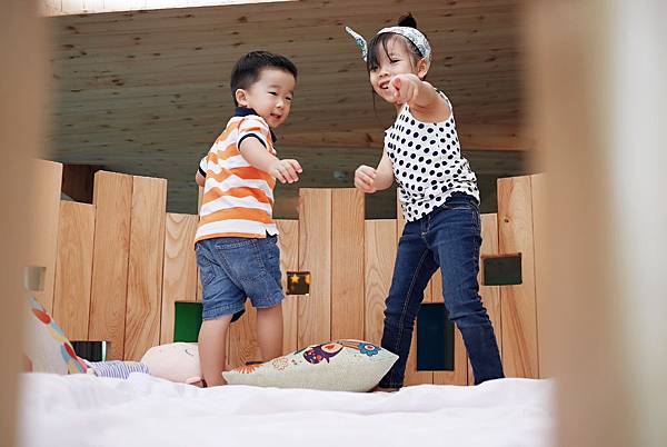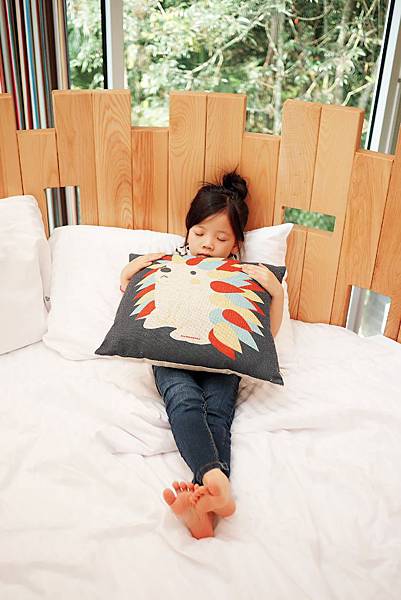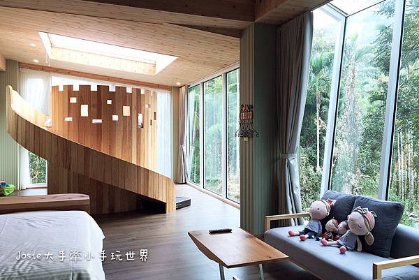 很喜歡房間整片落地窗的設計,有置身森林,被叢林圍繞的氛圍而原木製的溜滑梯城堡圓型床更是親子房另一大亮點