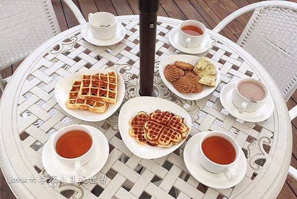 簡單的迎賓下午茶;自行取用的餅乾、咖啡、茶和需要DIY的鬆餅