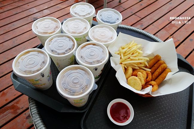 園區內有提供飲料、披薩、水餃、炸物、鬆餅及火鍋等,我們吃完午餐後才來所以以點飲料為主,麻糬鬆餅簡簡單單,但口味還不錯,中間有QQ的麻糬