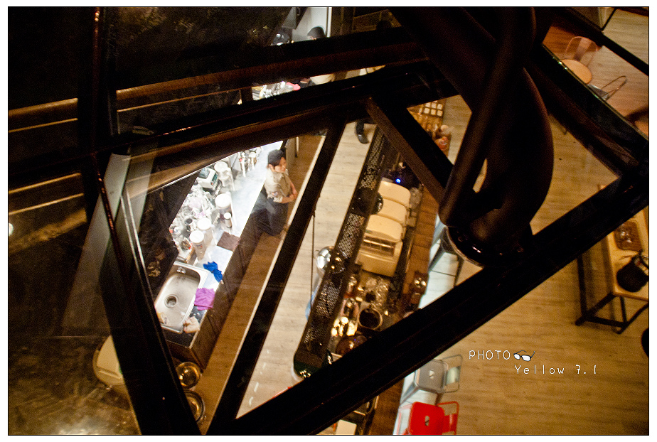 剛走進咖啡館的玻璃地面,哈哈!還是透明的,所以女生來要注意一下,別穿裙子比較好,除了避免在天空步道走光,在廠區裡走上走下也比較方便些^^