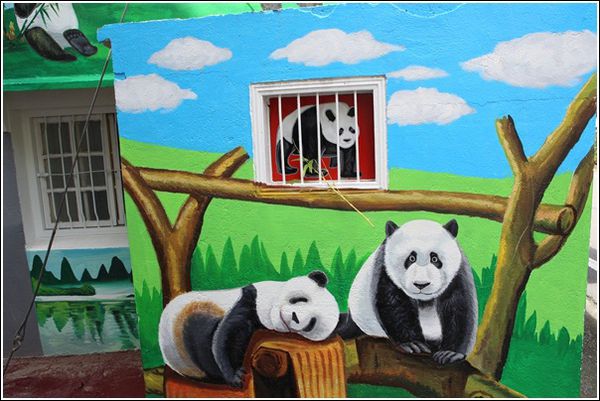 更精彩的貓熊彩繪就隱身在這條巷子裡,連續四面的彩繪牆呈現出貓熊的各種姿態,而且還可以和他們零距離互動喔!