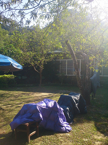 露營的這天有大好天氣,可以曬一下睡袋...睡袋長時間塞在床下,一定要拿出來曬一下,但不能在烈日下曬,會傷羽絨的。