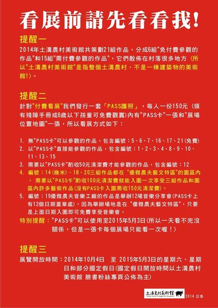 ↑ 本圖引用自土溝農村美術館粉絲圖照片PASS套的使用原則上每個展館以進入一次為限,期限可使用到2015年5月3日止,所以不用急著一天看完。