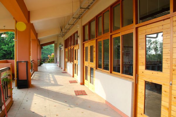 每間教室都是用樟樹木片來讓教室不會被陽光照到發燙,而且充份利用地形、風向及風景來建築