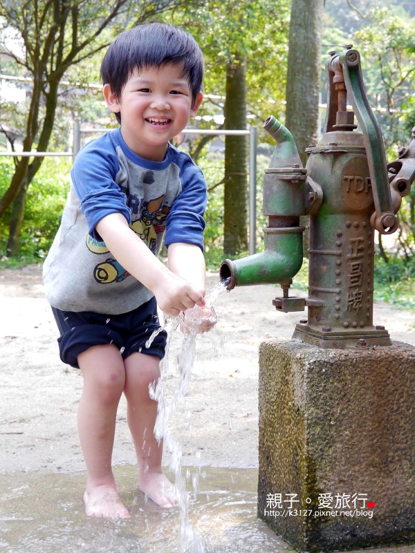 離開樹屋,就是一個約莫5坪大的沙坑,沙坑旁的古早味汲水器,反而是Kai弟的最愛,他在這裡,上上下下的壓了超過百回了。沙子就是一般的灰中帶黃的細沙子。