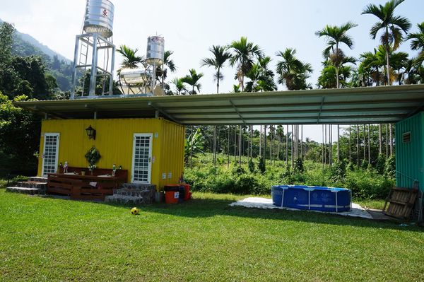 大草皮上這一大一小貨櫃屋就是老闆的週末別墅和衛浴棟,遮雨棚下還有一個讓小孩為之瘋狂的小泳池 。