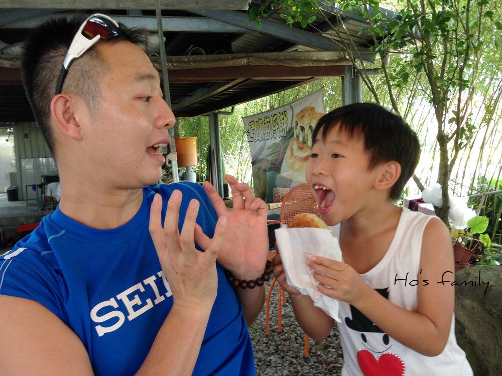 成品出爐囉!自己做的蔥油餅最好吃啦!啊~爸爸餵一口