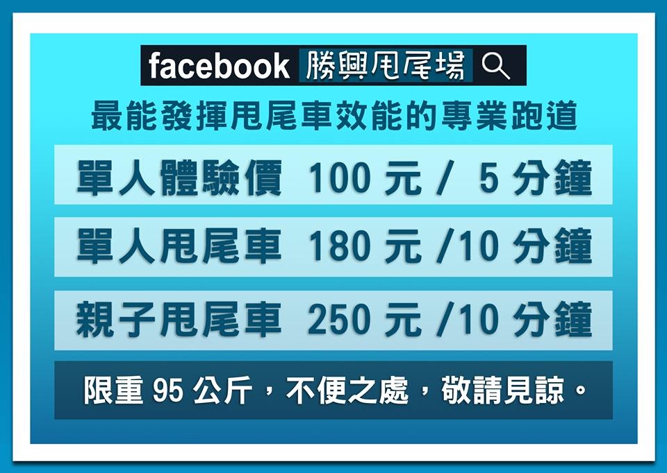 消費資訊單人體驗價100元/5分鐘,單人甩尾車180元/10分鐘,親子甩尾車250元/10分鐘