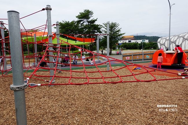 遊戲場中間為大型的繩索攀爬架,底下還鋪滿了木屑看起來新奇,玩起來也更為安全