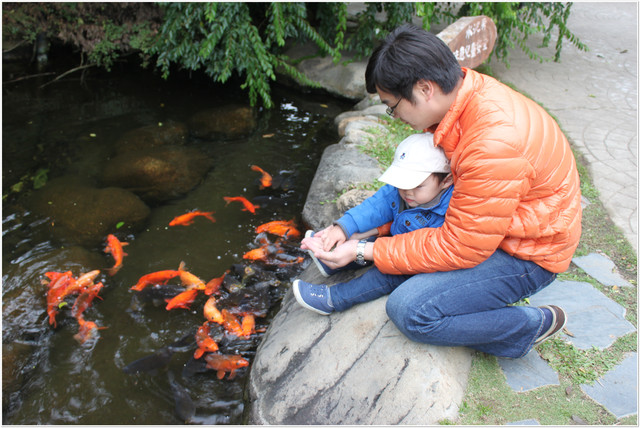一進門,旁邊就有魚池可以餵魚,小威最愛餵魚了,只是飼料用灑的,很快就餵光了