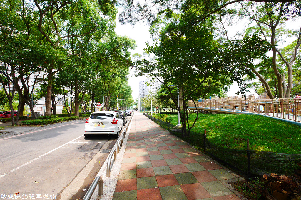 推娃娃車的家長也可以從高架棧道上來,一個友善空間,上方是藍色鋪面
