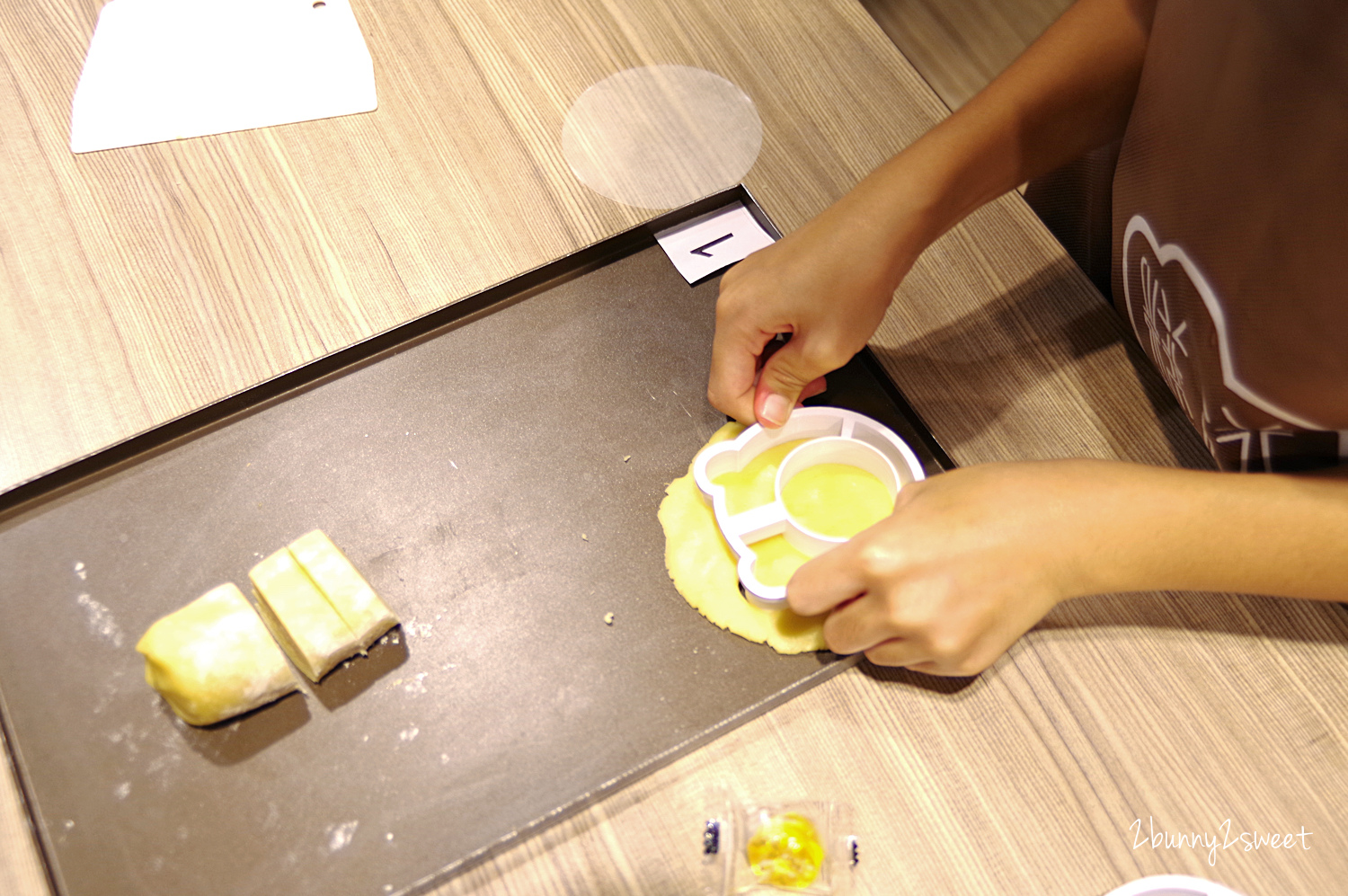 小朋友只需要切成三等份,在烘焙紙上把麵團壓平,然後用模型進行切割~