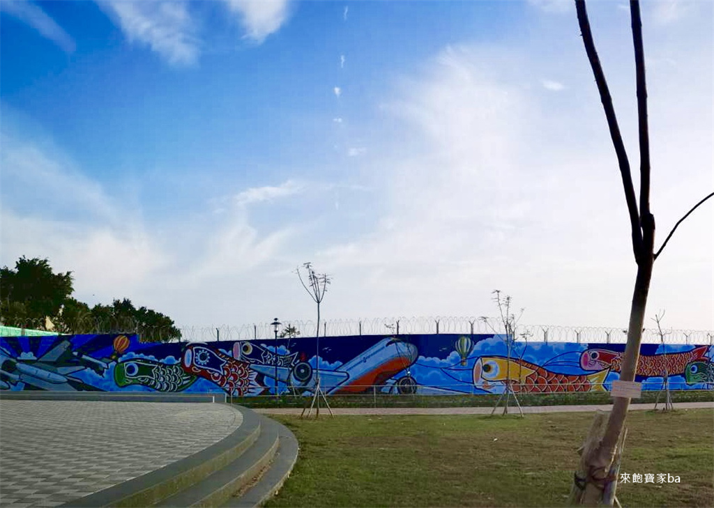 從舊的兒童遊戲區走到底後左轉,一望無際的空地正前方就是特色遊具區域及籃球場,左邊的圍牆則彩繪上飛機、鯉魚旗、熱氣球等呼應飛機主題