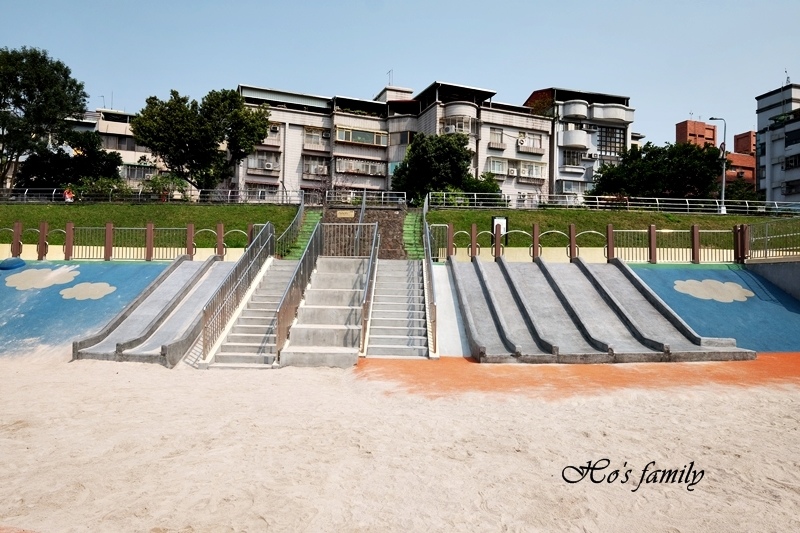 剛抵達時,從路邊停車格要找樓梯越過河堤到公園,發現除了樓梯也有設置無障礙坡道,方便爸媽們推娃娃車或是身障朋友坐輪椅也能上去,很貼心的規劃!最近遊戲場的樓梯是恆光街30巷這邊,爬上樓梯往下走就是遊戲場。