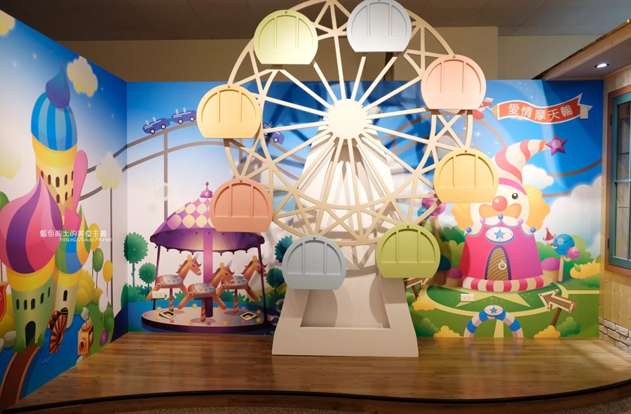 外面遊樂設施有樹屋、螺旋梯瞭望台、大型草皮式溜滑梯、跳跳床、彩色攀岩、炫彩遙遙蟲、攀爬網繩..等等