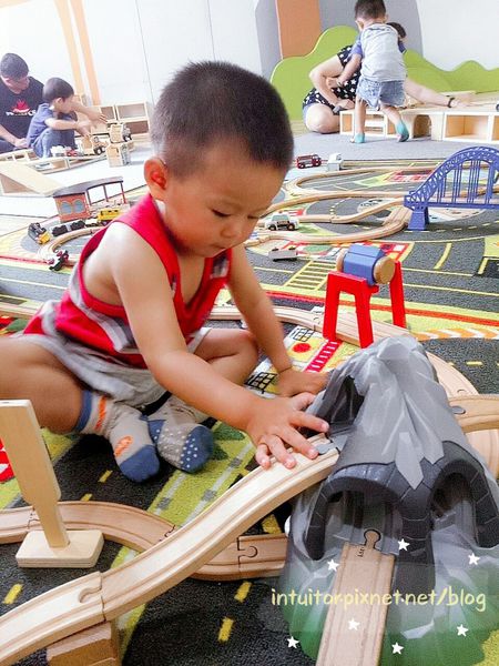 腿寶現在玩軌道火車玩具專注的時間可以超過半個小時。