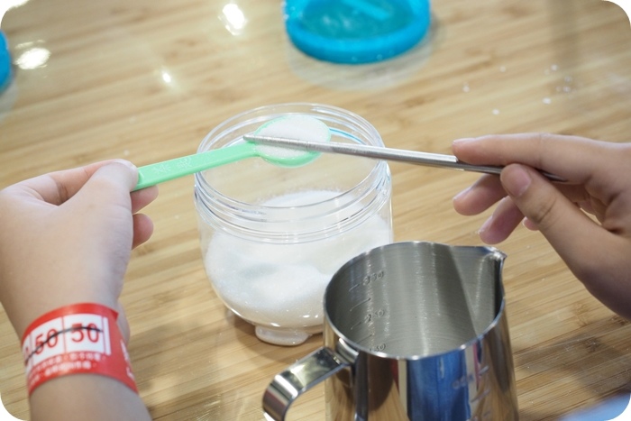 緩慢地攪拌均勻,總共要攪拌五分鐘,挑戰小朋友耐心。