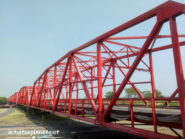 雞腿寶出世之後每日洗澡行程,總要拿上喜愛的玩水玩具一同洗澡。到了炎熱夏季,全家出遊玩水更是必排行程。肌膚被水溫柔包覆著,縱然頂著豔陽,在清涼的水流之間遊戲一點也感覺不到熱氣。即使沒有華麗的戲水設施,只要帶上各式容器、玩具就能夠讓雞腿寶玩上好一陣子。趁寒冬未來臨之前,再度安排還有開放戲水的公園遊玩。這天我們來到了西螺大橋親水公園,車子行輕西螺大橋,整齊排列的紅色鐵柱連上天際線,形成了規律的美感。親水公園就在大橋附近。還有磨石滑梯、藝術品進駐的高灘地景公園值得一遊。