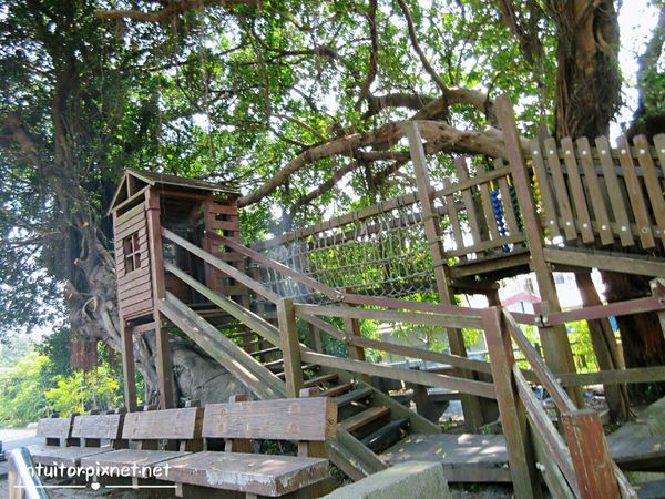 依著榕樹搭建的樹屋,在此遊玩好涼爽。有滑溜、獨木橋、斜坡、攀爬網。雞腿寶看得心癢癢的已經忍不住要起身去玩。看到一縷煙從滑梯下竄出,空氣中飄散著難聞氣味,顧及安全我們速速離開此處。不禁讓我覺得在此燃燒廢棄物者也太沒公德心了。