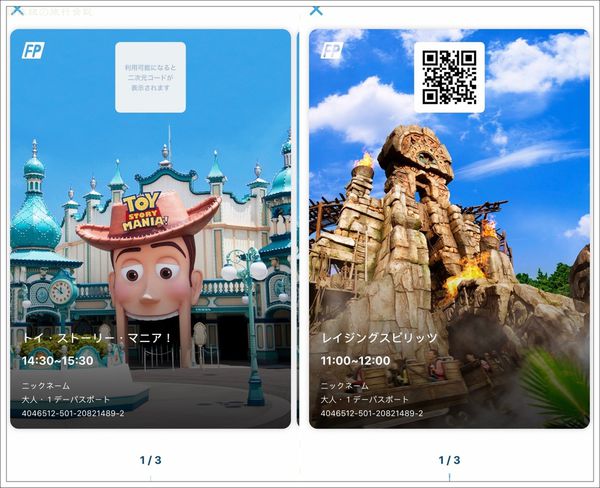 抽好快速通關之後,到設施走fp通道都要掃條碼! 不過條碼要到fp的時間到了才會顯示,不然就像上面左邊的toys一樣,QR Code會是空白的,當時間到的時候,會變成右邊那樣有QR code