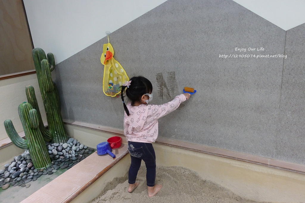 靠近門口的是乾沙區,裏面的則是溼沙區…溼沙區牆面也有巧思是水畫牆