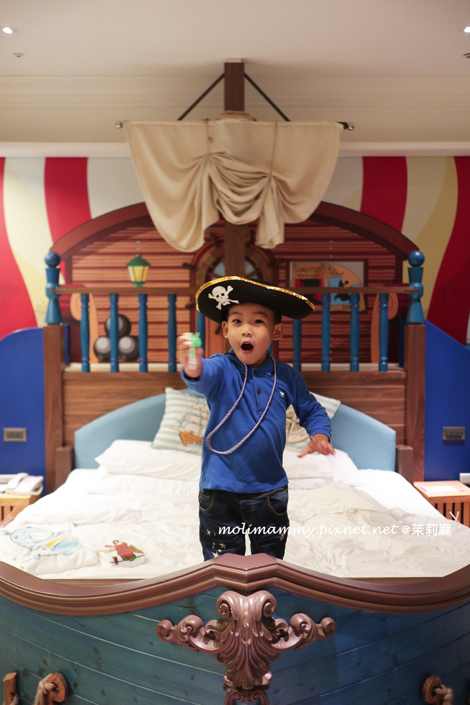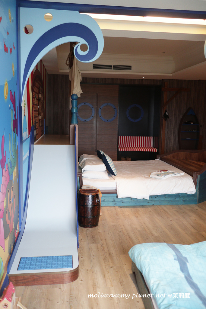 茉莉家這回入住的是海洋冒險風格的親子主題套房,整間房間大小約 18 坪左右,裝潢皆以海盜船的主題做設計,牆壁的繪畫風格則是海底世界,整個就很有像是海盜船長即將出發冒險的感覺啊