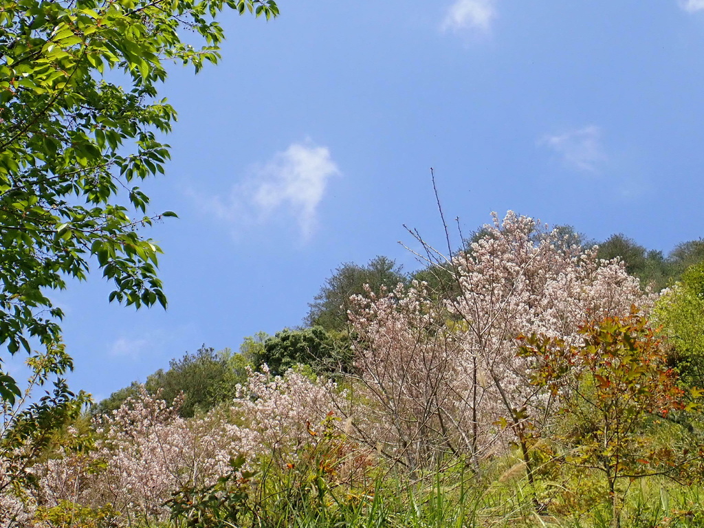 但一旁還有零星幾棵不同品種的粉嫩櫻花盛開著