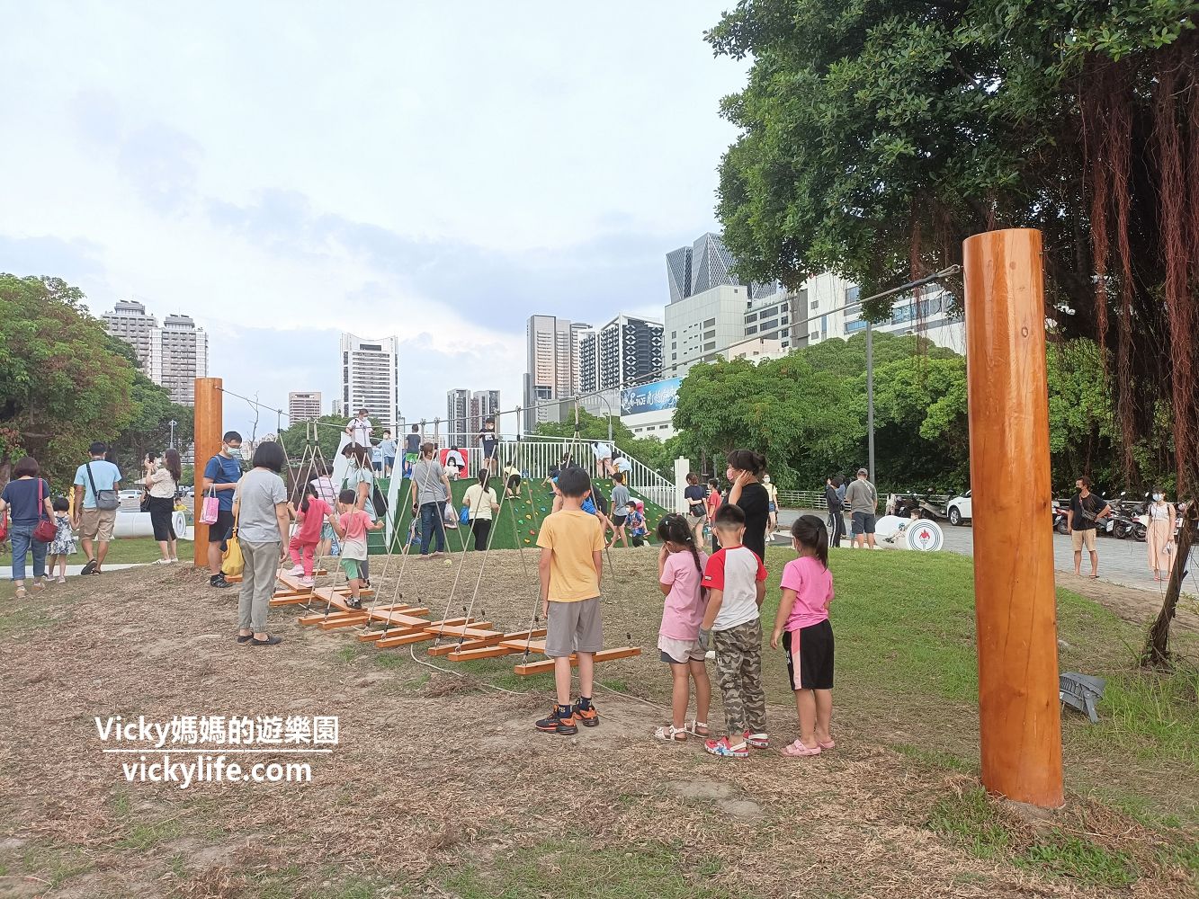 除了好幾組大型攀爬網遊具外,在一旁的草地上也設有小森林勇士的遊具,孩子們可以小心翼翼的經過每個挑戰,只不過這裡也有部分設施已經損壞了,不是才開放一個月嗎?到底是太多人來玩,還是不當使用遊具所造成的呀!