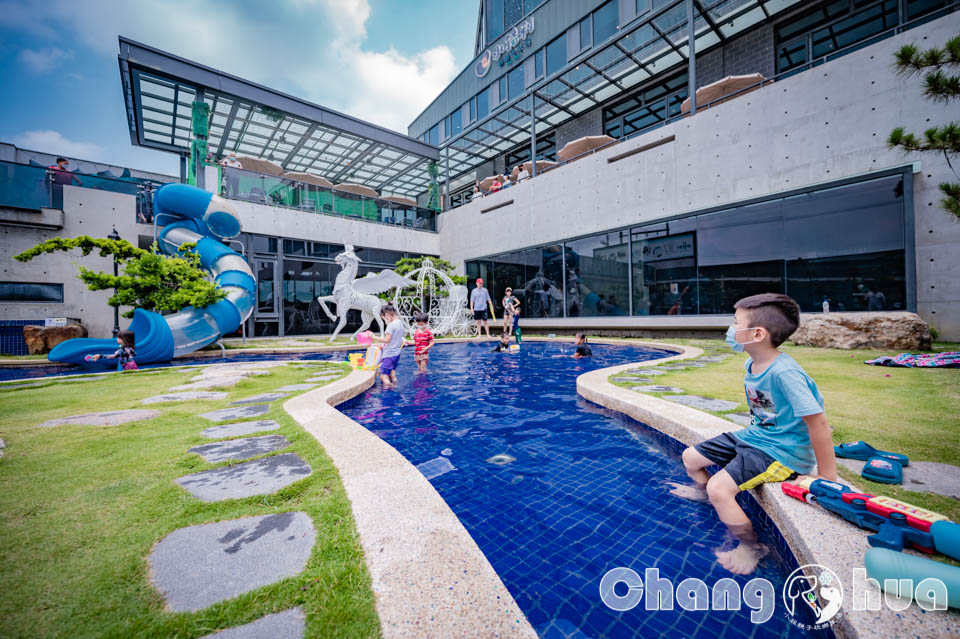 戶外區有點微歐風庭院的感覺,這區有戲水池、沙坑和鯉魚池。藝術裝置部分是一輛純白南瓜馬車,還是有翅膀的飛馬喔~但是戲水區沒有遮陽設備,夏天好曬啊!!