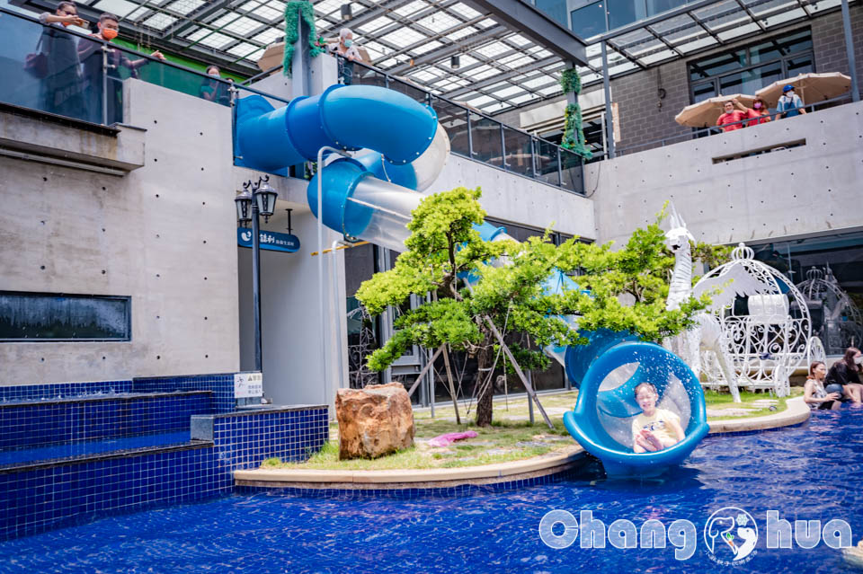 戲水池的水深算淺,大約到寶寶的小腿肚位置,比較適合小童和中童,像瑄瑄姊姊就稍嫌大了一點。今天來玩水的人可不少,小孩們來來回回玩有速度感的溜滑梯,大人們則是愜意的泡在水裡兼顧小孩。