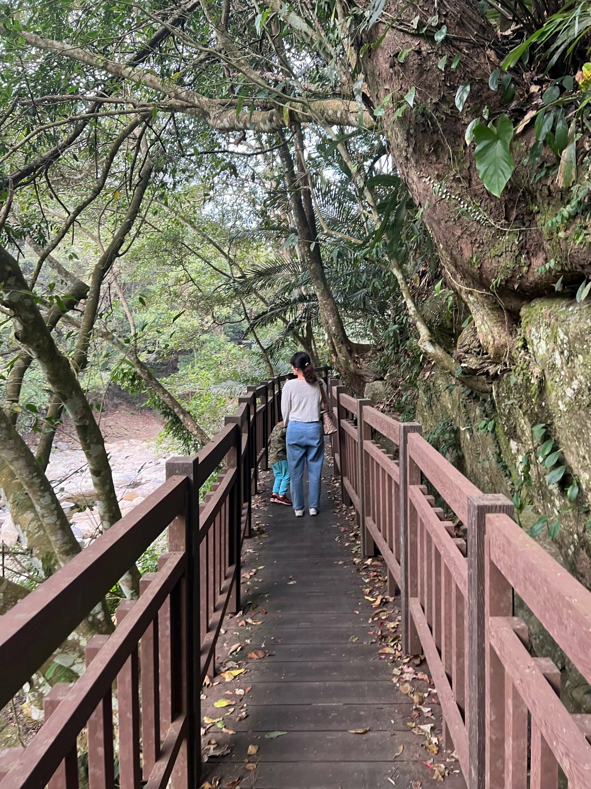 在這裡,可以將車子停在蓬萊溪護魚步道,由木棧道樓梯往下走,便是一大片高聳樹林,再往前走約莫百公尺後,便可以聽見潺潺流水聲,走在溪邊的石子路上,可以看到山裡的環境維護的很不錯。清澈見底的溪水,貼心叮嚀的小告示牌,沿途更有生態看板介紹各種魚類及鳥類;我們一面說著大自然的故事,一面玩起尋找各種魚的遊戲!平坦的木棧道與石子步道相間,讓小小孩也能輕鬆走完,Sherman 弟一路上有說有笑,還搶在媽媽抵達終點前先到停車場,這時候一定要給他一個大大的鼓勵!