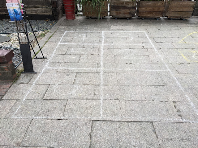 前院地板上還畫了一些跳房子,旁邊也有販賣部賣冰棒等小物,這些有趣的小遊戲應該可以讓孩子在這裡待上好一陣子,父母則可在一旁桌椅,納涼休息一下。