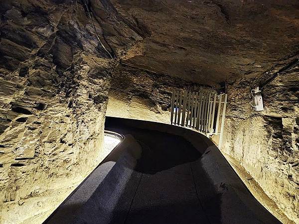 防空洞內保留具歷史感的岩壁,而步道兩側的空隙可讓岩壁滲下的水滴匯流經過,盡可能完整呈現原始的樣貌。