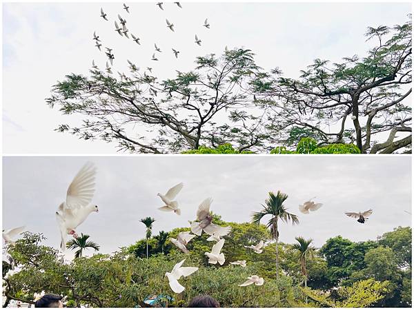 成群漂亮的鴿子們在天空上變換著不同排列隊形,真的很壯觀也好讓人驚艷!也是園區重頭戲之一~大家時間一到都立刻聚集在一起看表演
