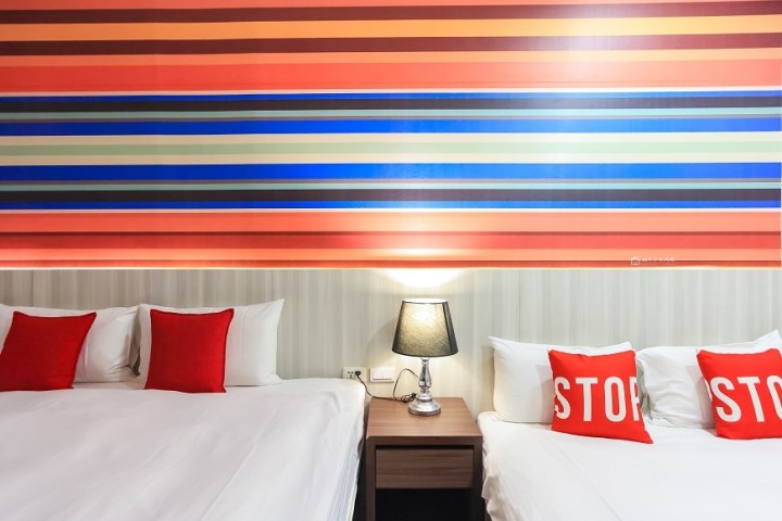 將將將將~開箱房間啦!我們這次住的是賽車親子套房~一進門就被鮮豔的線條吸引,一直盯著牆面看還真的頗有賽車飆速產生的視覺效果!!!