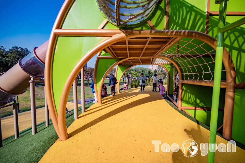 ▼淘氣猿遊戲區念起來有點饒舌,還是叫草坡探險區比較順口。此遊戲區不僅設施多元,黃色系的遊具也讓此區更亮眼。有意思的還有窪地的規劃設計,空間利用相當到位,裡外都是小朋友們的遊戲場。