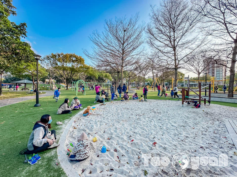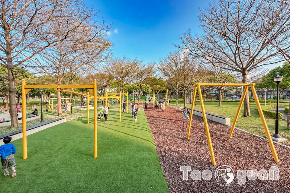 ▼穿過多功能草坪來到靠近陽明公園管理中心的【猿林遊戲區】,此遊戲區包含:溜索、滑軌、綜合鞦韆(高鞦韆、旋轉鞦韆)與歡樂沙坑。