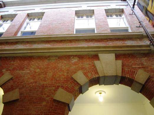 離開展覽室,這館裡的紅磚牆面、白色樑柱,讓我們細細觀賞。