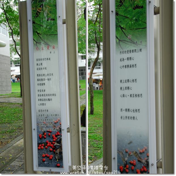 人行步道兩旁有著許多相思豆的詩選立板,其實也挺適合靜下心慢慢欣賞,尤其人行步道兩旁的樹蔭翁鬱,微風徐徐,走在其中很有渡假悠閒感。