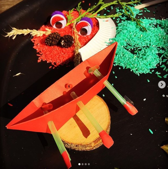 1. 彩色米龍舟與龍:運用彩色米、竹葉和紙船,擺設好邀請小孩一起來玩。彩色米在Messy play 是非常廣泛運用的素材之一。雖然玩完後顏色都混合在一起,之後還是可以隨時拿出來玩,對手部肌肉訓練跟感官刺激都很有幫助。