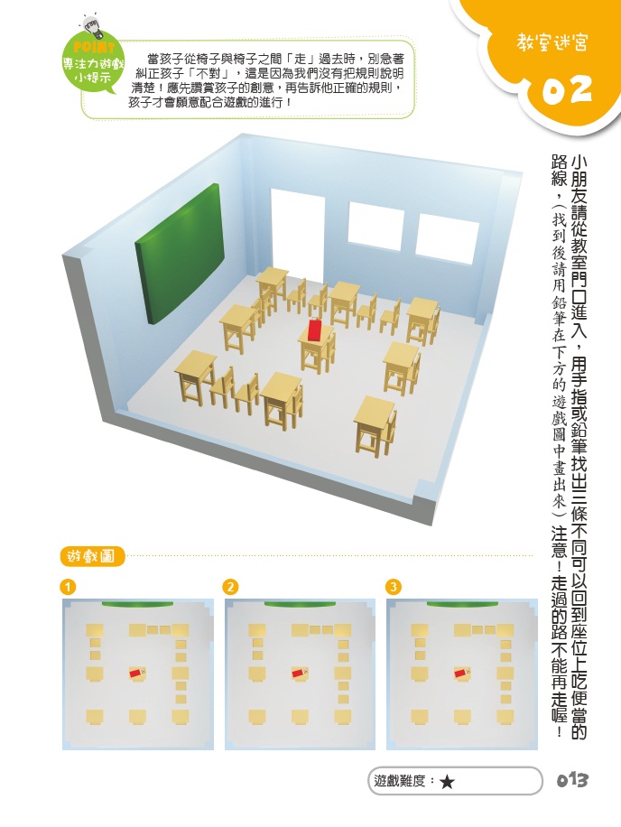 此外,對於孩子的視覺空間能力也有相當的助益,因為孩子必須能夠將紙本(二度空間)上的圖案想像成實際的教室(三度空間),才能正確判斷可以行走的路線,因此這個遊戲不僅幫助孩子在紙筆操作時的專注力,同時也協助孩子空間移動專注力的提升。