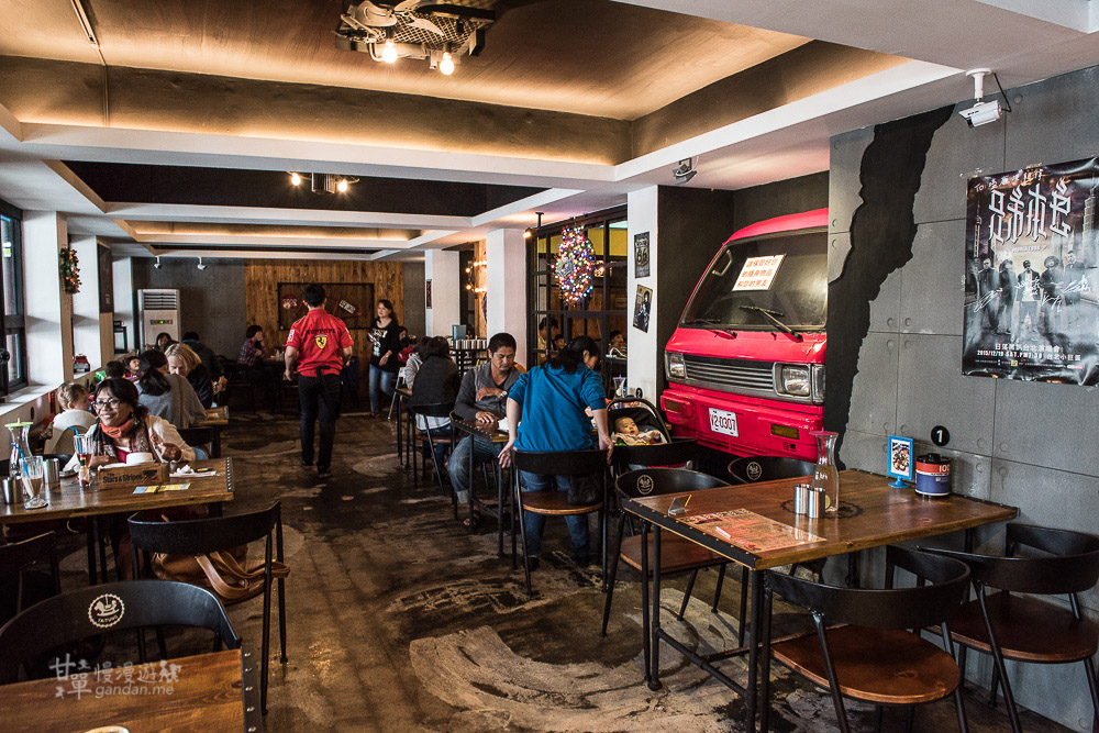 走進餐廳後先是吧枱加點餐櫃枱,幾種元素的混搭風格,最吸睛的還是那輛大紅貨車頭成為室內裝潢一部份,而我們則被安排到最裡頭的一區,那裡還有個半開放的小包廂正好給這群孩子們坐在一起。